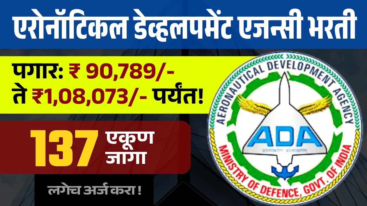 (मुदतवाढ) ADA Bharti 2025: एरोनॉटिकल डेव्हलपमेंट एजन्सी मध्ये 137 जागांची भरती; पगार ₹1,08,073/- पर्यंत!