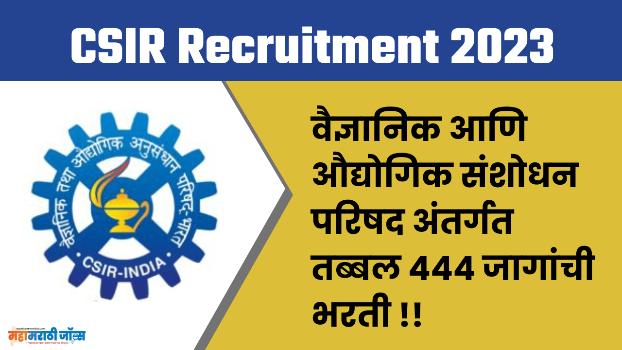 CSIR Recruitment 2023 CSIR Recruitment 2023: वैज्ञानिक आणि औद्योगिक संशोधन परिषद अंतर्गत विविध पदाच्या एकूण 444 जागांसाठी भरतीची जाहिरात प्रकाशित करण्यात आली आहे.....