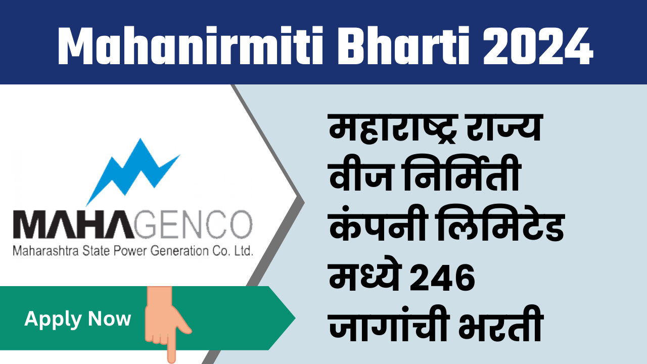 Mahanirmiti Bharti 2024 Mahanirmiti Bharti 2024: महाराष्ट्र राज्य वीज निर्मिती कंपनी लिमिटेड अंतर्गत विविध पदाच्या एकूण 246 जागांसाठी भरतीची जाहिरात नुकतीच प्रकाशित करण्यात....