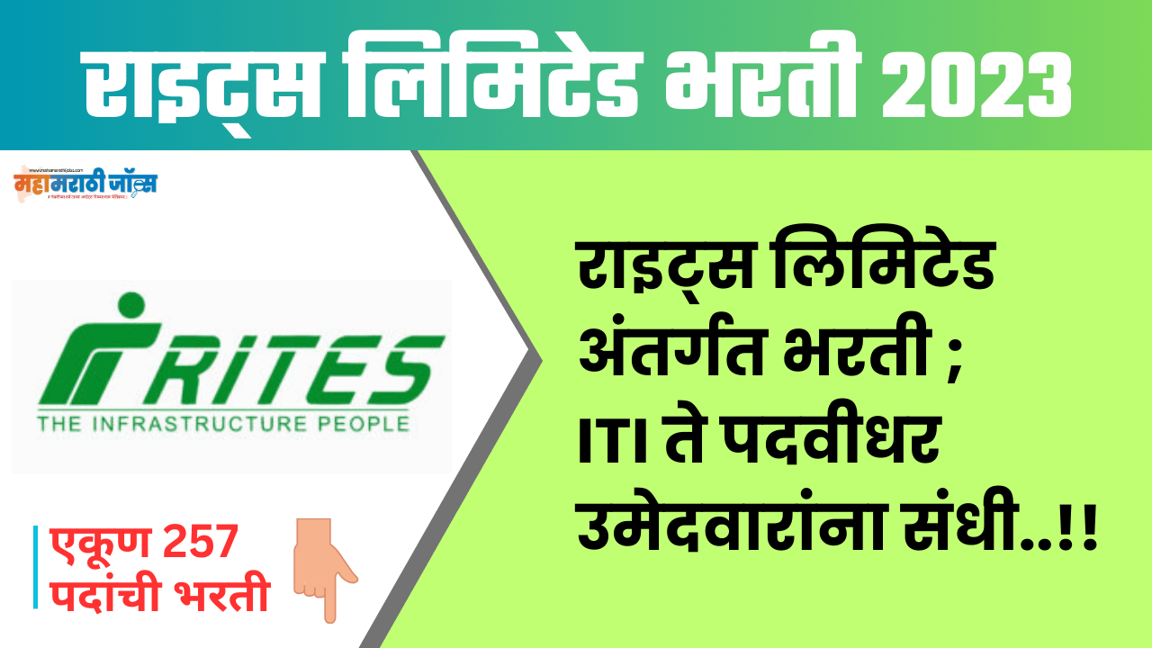 RITES Limited Bharti 2023 RITES Limited Bharti 2023: राइट्स लिमिटेड अंतर्गत विविध पदाच्या एकूण 257 जागांसाठी भरतीची जाहिरात प्रकाशित करण्यात आली आहे. पात्र....